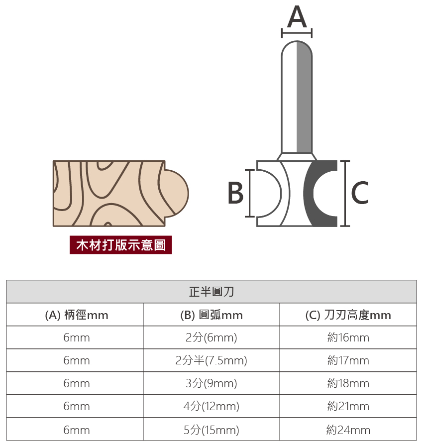 品名:正半圓刀 尺寸:2分(6mm)/2分半(7.5mm)/3分(9mm)/4分(12mm)/5分(15mm) 適用:修邊機 用途:側邊雕刻正1/2圓型的線條/可製作圓棒