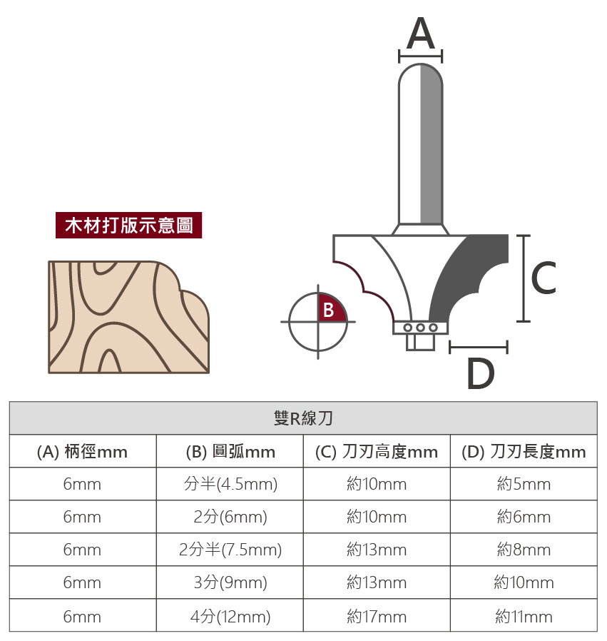雙R線刀 6*分半(4.5mm), 雙R線刀 6*2分(6mm), 雙R線刀 6*2分半(7.5mm), 雙R線刀 6*3分(9mm), 雙R線刀 6*4分(12mm)