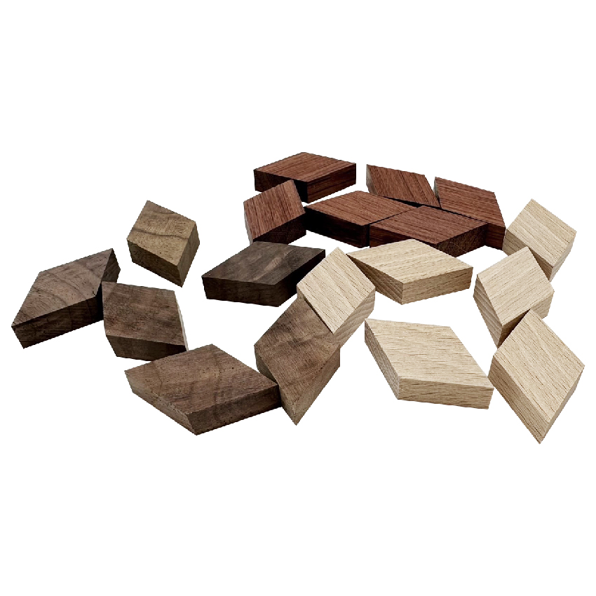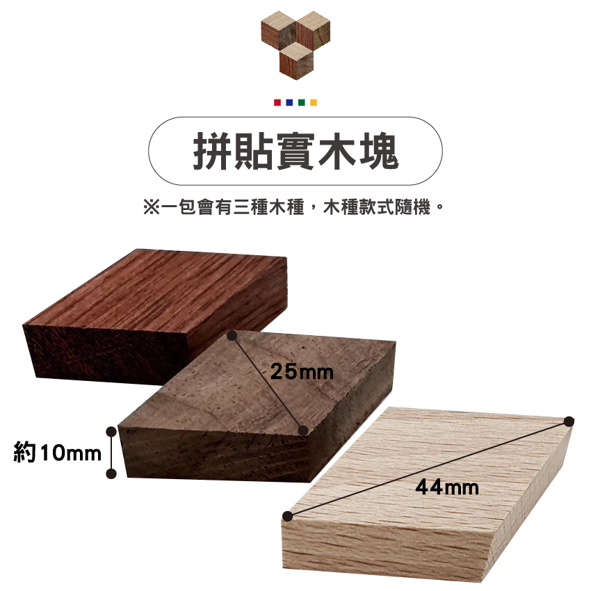 品名:DIY拼貼實木塊 材質:三種實木各六片(※款式隨機) 尺寸:約1×2.5×4.4cm 數量:共18片 備註: ※木材是自然生長,木紋和木節是無法避免的 ※部分商品會有些許毛邊 ※因加工時會有公差,拼貼時邊緣可能會有縫隙 ※木材本身多少有特殊紋理,無法挑選款式